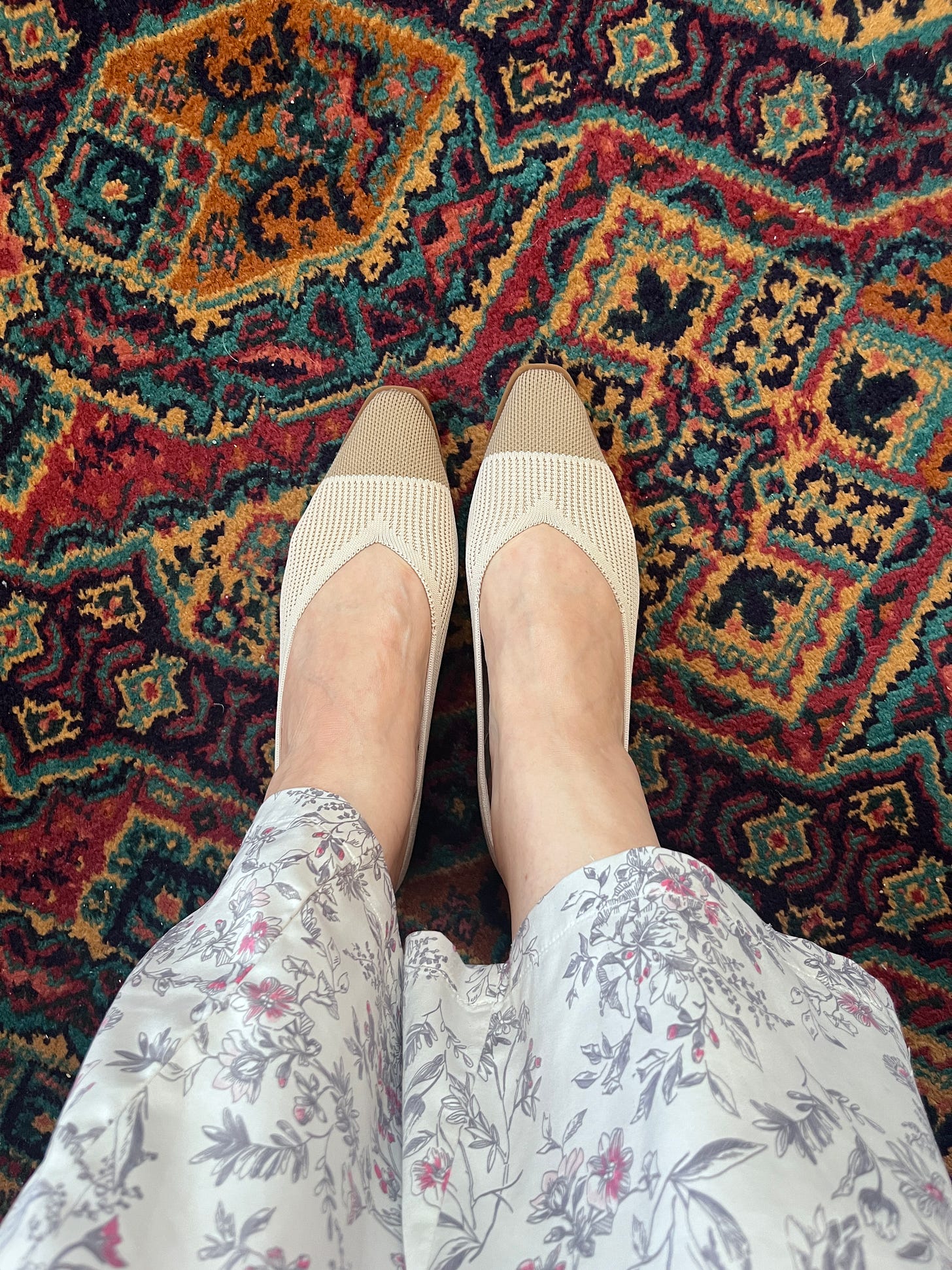 I did some lovely shopping too, the floral trousers already pictured, and a pair of black pleather trousers for winter, from a favourite shop called Blue Illusion (an Australian brand which has a store in Palmerston North), and a pair of knit shoes a bit like Vivaia or Rothys, neither of which we can get here. These ones are by a brand called Los Cabos. They are pictured with my relaxing satin trousers so they don’t really go! But I haven’t worn them properly yet :)
